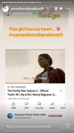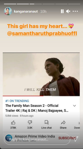 कंगनाने इंस्टाग्राम स्टोरीवर ‘द फॅमिली मॅन २’ वेब सीरिजच्या ट्रेलरसचा स्क्रीनशॉट शेअर केला आहे. यासोबतच तिने लिहिले आहे की, “या मुलीने माझे हृदय घेतले आहे.” या स्क्रीनशॉटमध्ये समंथाची सीरिजमधील भूमिका दिसत आहे. यासोबतच सबटायटलमध्ये ‘मी त्यांना मारून टाकेल (I Will Kill Them)’ असे लिहिले आहे.