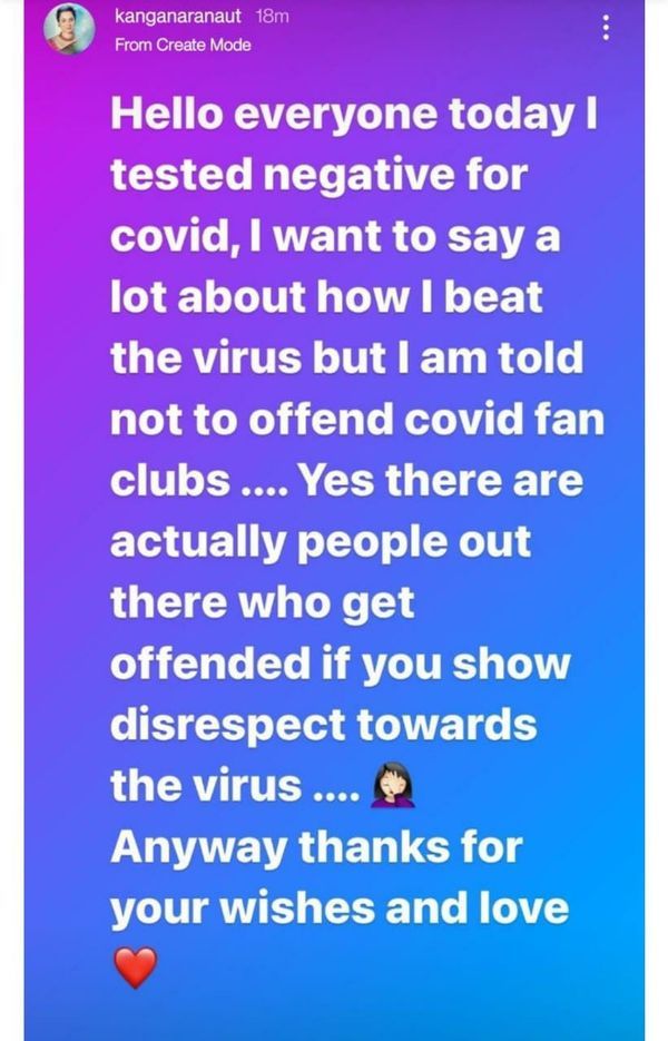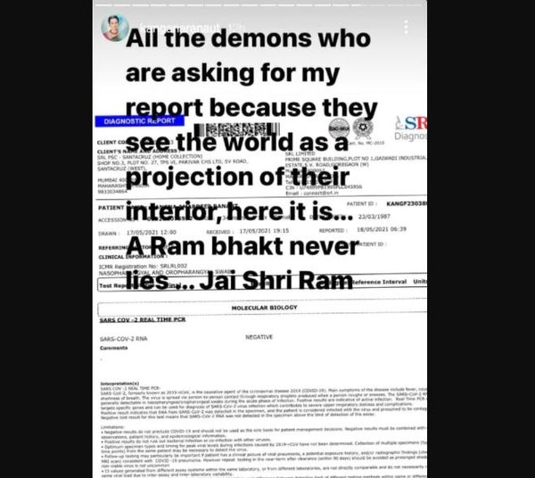 लोकांना विचारलेल्या या प्रश्नावर तिने तिचा कोरोना निगेटिव्ह रिपोर्ट शेअर करून सर्वांची बोलतो बंद केली आहे. कंगनाने तिच्या इंस्टाग्राम स्टोरीला रिपोर्ट शेअर करून लिहिले आहे की, “सगळे राक्षस आहेत जे माझ्याकडे माझा कोरोना निगेटिव्ह असण्याचा रिपोर्ट मागत आहेत, कारण ते तसे आहेत. त्यामुळे त्यांना संपूर्ण दुनिया तशी दिसत आहे. ही पोस्ट त्यांच्यासाठीच आहे. एक राम भक्त कधी खोटं बोलत नाही. श्री राम.”