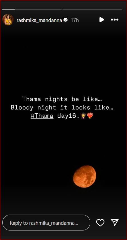 रश्मिका मंदान्नाने इंस्टाग्राम स्टोरीवर ‘थामा’ चित्रपटाबद्दलची एक खास गोष्ट शेअर केली आहे. “थामाच्या रात्री अशाच असतील… रक्तरंजित रात्रीसारख्या दिसतील…थामाचा १६ वा दिवस,” तिने हे लाल चंद्राच्या फोटोसह लिहिले. रश्मिकाच्या या पोस्टनंतर चाहत्यांमध्ये थामाबद्दलची उत्सुकता अधिकच वाढली आहे.