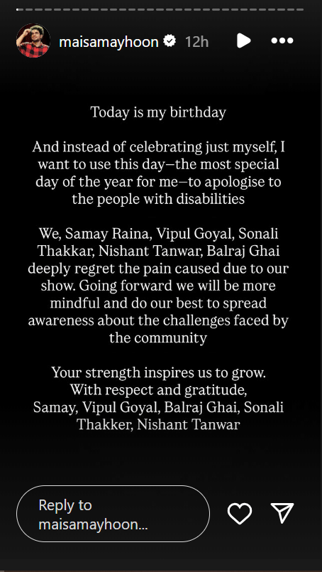 समय रैनाने त्याच्या इंस्टाग्रामवर त्याचा वाढदिवस साजरा करण्यासाठी एक स्टोरी शेअर केली. स्टोरीमध्ये त्याने एक नोट लिहिली. नोटमध्ये समयने लिहिले की, “आज माझा वाढदिवस आहे आणि तो फक्त साजरा करण्याऐवजी, मी या दिवसाचा वापर, जो माझ्यासाठी वर्षातील सर्वात खास दिवस आहे, तो अपंग लोकांची माफी मागण्यासाठी करू इच्छितो.”