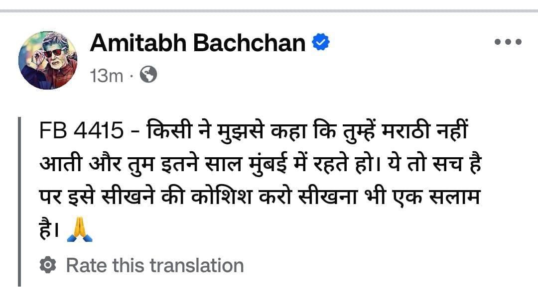 अमिताभ बच्चन यांनी सोशल मीडिया प्लॅटफॉर्म फेसबुकवर एक पोस्ट शेअर केली आहे. त्यात त्यांनी लिहिले आहे की, ‘कोणीतरी मला सांगितले की तुला मराठी येत नाही आणि तू इतक्या वर्षांपासून मुंबईत राहतोस. हे खरे आहे पण ते शिकण्याचा प्रयत्न कर, शिकणे देखील एक सलाम आहे’.