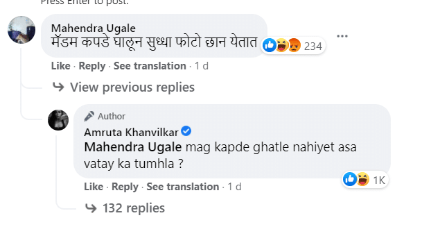 या फोटोमधील अमृताच्या अदा अगदी पाहण्यासारख्या आहेत. अभिनेत्रीचे हे फोटो नेटकऱ्यांच्या पसंतीस उतरले आहेत. म्हणूनच बघता बघता फोटोवर लाईक्स अन् कमेंट्सचा पाऊस पडलेला पाहायला मिळतोय. आतापर्यंत या फोटोवर हजारो युजर्सने लाईक केले आहे. तर याचवेळी कमेंट करत युजर म्हणाला की, “मॅडम कपडे घालून सुद्धा फोटो छान येतात.” ही कमेंट पाहून अभिनेत्री स्वतःला रोखू शकली नाही आणि तिने लगेचच याला प्रत्युत्तर दिलं. त्या कमेंटला रिप्लाय देत अमृता म्हणाली की, “मग कपडे घातले नाहीत, असं वाटतंय का तुम्हाला?” अभिनेत्रीचे हे फोटो आणि हे प्रत्युत्तर आता सोशल मीडियावर चांगलंच चर्चेत आलं आहे.