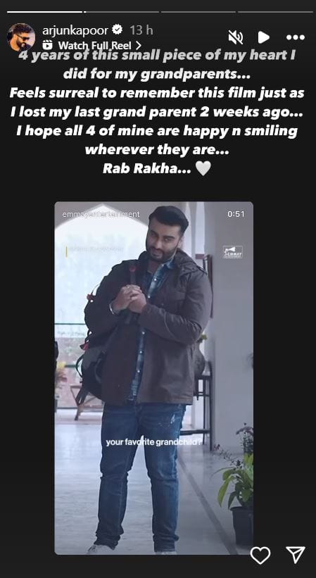 चित्रपटातील एक क्लिप शेअर करत अर्जुन कपूरने कथेत एक चिठ्ठी लिहिली. तो म्हणाला, ‘मी माझ्या हृदयाचा हा छोटासा तुकडा चार वर्षांपूर्वी माझ्या आजोबांसाठी बनवला होता. हा चित्रपट आठवून खूप छान वाटतंय, कारण मी माझे शेवटचे आजोबा दोन आठवड्यांपूर्वीच गमावले होते. मला आशा आहे की माझे चारही आजी-आजोबा जिथे असतील तिथे आनंदी आणि हसत असतील. देव तुम्हाला आशीर्वाद देवो. या महिन्यात २ मे रोजी अभिनेत्याची आजी निर्मल कपूर यांचे वयाच्या ९० व्या वर्षी मुंबईत निधन झाले.