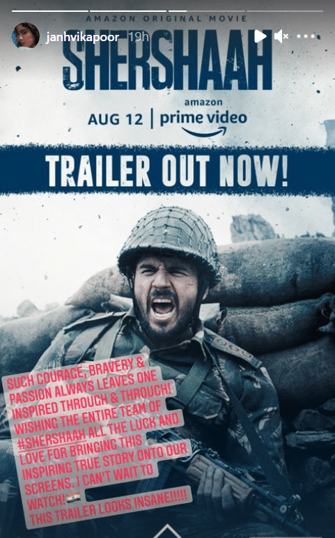जान्हवीने लिहिले आहे की, “असा धाडसीपणा, इच्छाशक्ती नेहमीच प्रेरित करते. ‘शेरशाह’च्या पूर्ण टीमने ही प्रेरक कहाणी स्क्रीनच्या माध्यमातून सगळ्यांपर्यंत पोहचवली. त्यासाठी सर्वांना खूप प्रेम आणि शुभेच्छा. मी हा चित्रपट बघण्यासाठी आता जास्त वेळ वाट नाही पाहू शकत.”