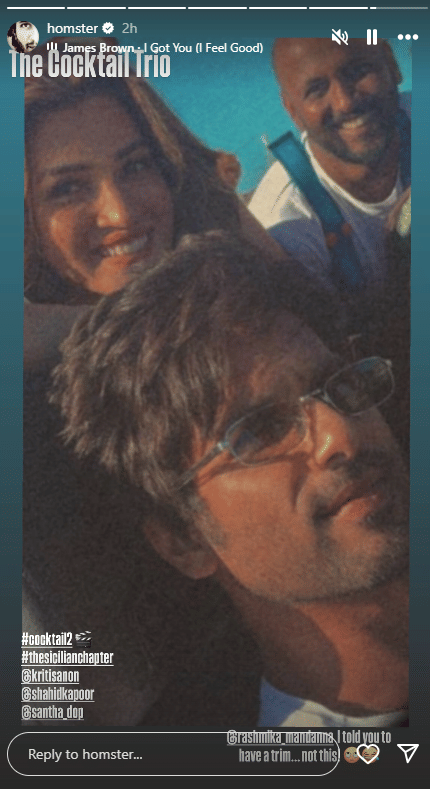 सध्या, क्रिती सेनन, रश्मिका मंदाना आणि शाहिद कपूर त्यांच्या नवीन चित्रपट “कॉकटेल २” चे चित्रीकरण इटलीमध्ये करत आहेत. या रोमँटिक ड्रामा चित्रपटात रश्मिका मंदाना, क्रिती सेनन आणि शाहिद कपूर पहिल्यांदाच एकत्र दिसणार आहेत. हा चित्रपट होमी अदजानिया यांनी दिग्दर्शित केला आहे आणि दिनेश विजन यांच्या मॅडॉक फिल्म्सने निर्मित केला आहे. हा २०१२ च्या हिट चित्रपट “कॉकटेल” चा सिक्वेल आहे.