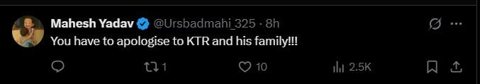 एका युजरने लिहिले, “समंथाबद्दल काय? तुम्ही एक आदरणीय महिला आहात आणि तुमच्या राज्यातील सर्वोच्च पदांपैकी एक आहात. कृपया इतर महिलांबद्दल अपमानास्पद टिप्पणी करण्यापूर्वी काळजीपूर्वक विचार करा.” दुसऱ्या वापरकर्त्याने लिहिले, “तुम्ही केटीआर आणि त्यांच्या कुटुंबाचीही माफी मागावी.” दुसऱ्या वापरकर्त्याने लिहिले, “ही माफी नाही; तुम्ही माफी नाही तर पश्चात्ताप व्यक्त करत आहात.”
