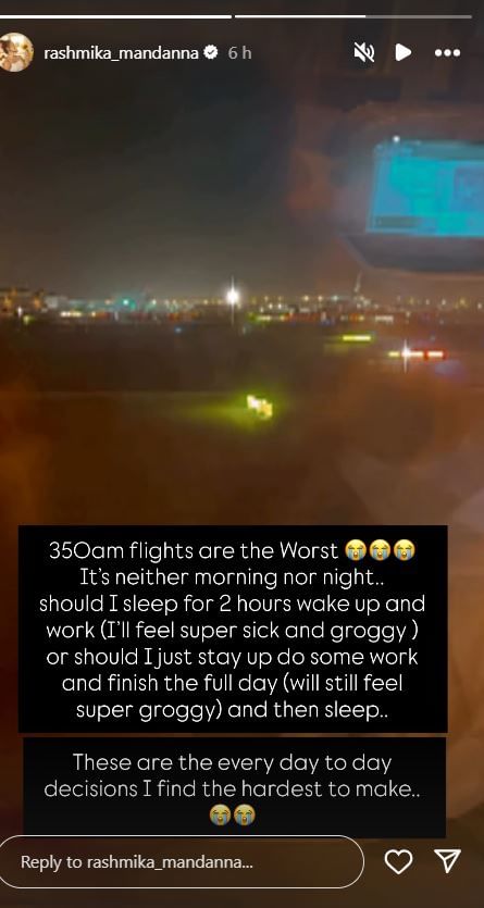 रश्मिका मंदाना हिने तिच्या इंस्टाग्रामवर एक स्टोरी शेअर केली आहे. यामध्ये तिने तिच्या फ्लाइटचा एक फोटो शेअर केला आहे आणि लिहिले आहे की, ‘पहाटेचे ३:५० चे फ्लाइट सर्वात वाईट असतात. आज ना सकाळ आहे ना रात्र.’ ती पुढे म्हणाली, ‘मी दोन तास झोपावे, उठून काम करावे (मला खूप आजारी आणि सुस्त वाटेल) की मी फक्त उठून काही काम करावे आणि संपूर्ण दिवस संपवावा (तरीही मला खूप सुस्त वाटेल) आणि नंतर झोपावे. हे रोजचे निर्णय आहेत जे घेणे माझ्यासाठी सर्वात कठीण आहे.’ ही पोस्ट करताना, अभिनेत्रीने रडणारा इमोजी टाकला आहे, जो तिच्या अस्वस्थतेची स्थिती व्यक्त करत आहे.