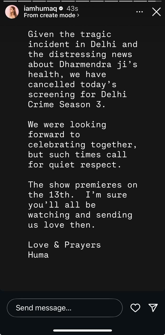 शिवाय, दिल्ली बॉम्बस्फोट आणि धर्मेंद्र यांच्या प्रकृतीमुळे, “दिल्ली क्राइम ३” या आगामी वेब सिरीजचे प्रदर्शन रद्द करण्यात आले आहे. या मालिकेचा भाग असलेली अभिनेत्री हुमा कुरेशी म्हणाली, “दिल्लीतील दुःखद घटना आणि धर्मेंद्र यांच्या प्रकृतीमुळे, आम्ही आजचे प्रदर्शन रद्द केले आहे. आम्हाला एकत्र आनंद साजरा करायचा होता, परंतु या काळात, आम्हाला थोडा संयम बाळगावा लागेल. दिल्ली क्राइम ३ १३ नोव्हेंबर रोजी प्रसारित होईल. आम्हाला आशा आहे की तुम्ही ते पहाल आणि आमच्यावर तुमचे प्रेम दाखवाल.”