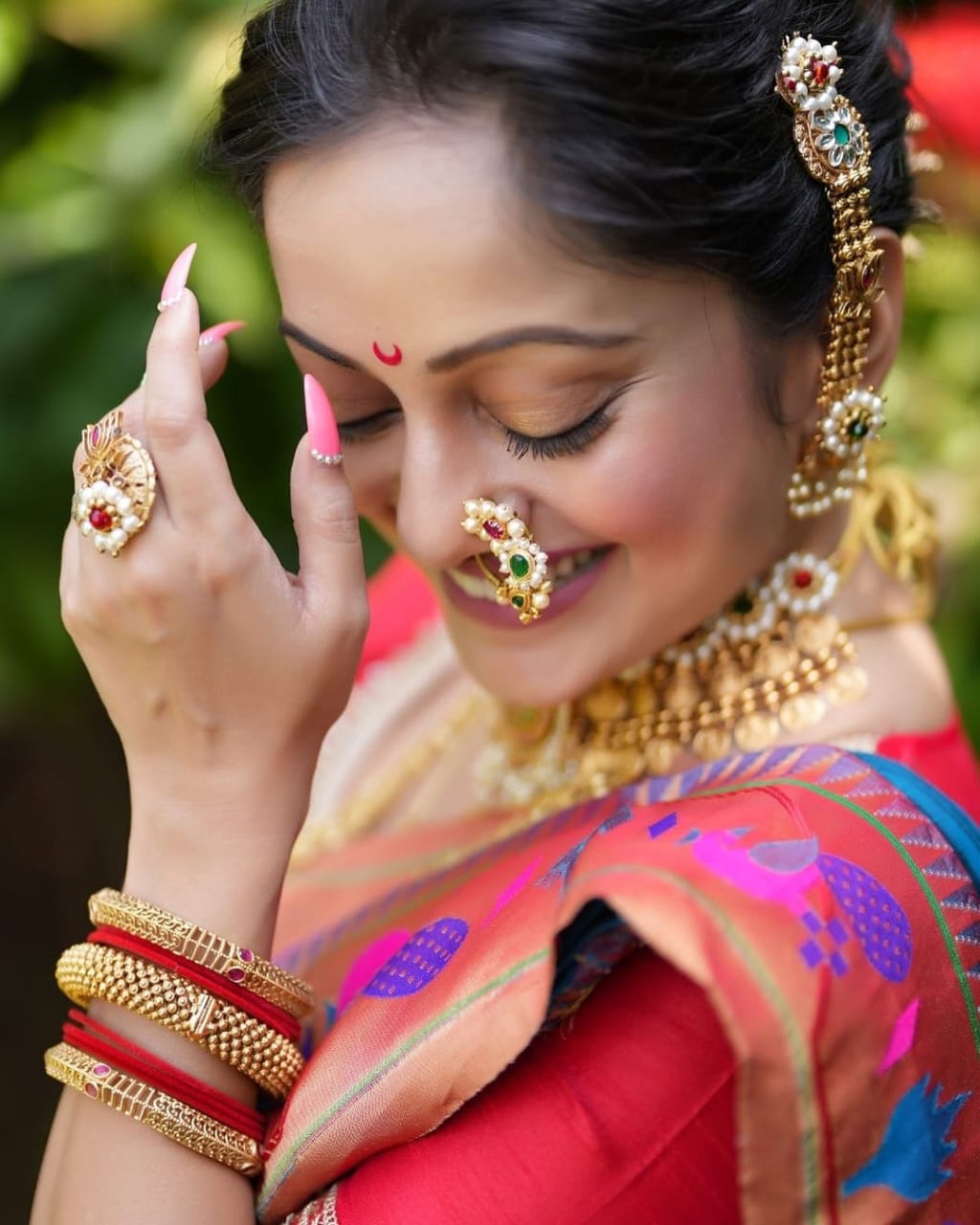 या फोटोमध्ये मानसीने नऊवारी साडी आणि मराठमोळा साज शृंगार केला आहे.